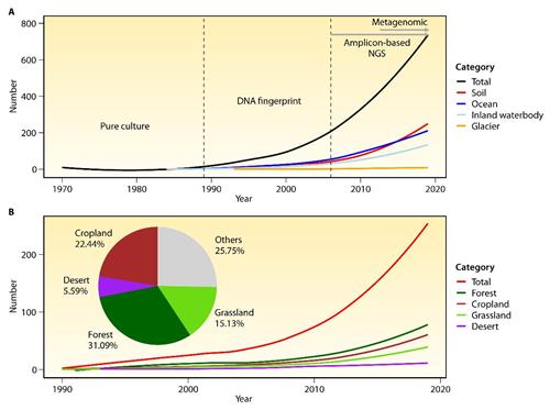 图1 微生物生物地理学研究发文量随时间变化趋势。(A)不同生态系统中发文量随时间变化趋势对比。(B)陆地不同生态系统中发文量随时间变化趋势对比
