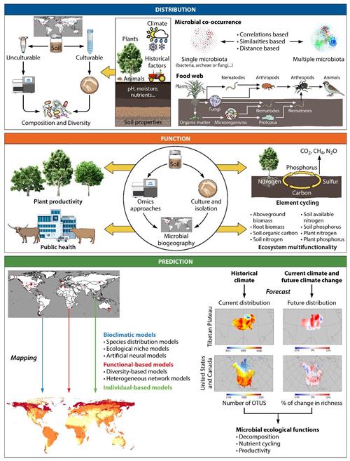 (3)全球变化背景下土壤生物多样性及其功能的分布图谱绘制。目前,我们已经可以对某些微生物类群的分布及功能进行预测,然而,仍缺乏对核心微生物或关键物种的预测。数据库的扩展、微生物群落的时间动态和微生物间的互作关系对于提高模型的预测精度及微生物分布图谱的绘制至关重要。高精度模型可进一步用于预测环境变化下的土壤生物多样性和生态系统功能的时空动态,并有助于气候变化下的土壤生物多样性保护和生态功能发挥。